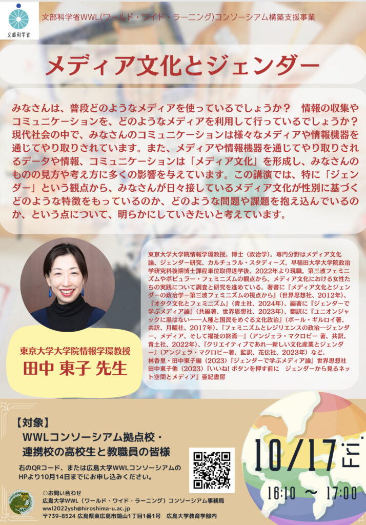 みなさんは、普段どのようなメディアを使っているでしょうか? 情報の収集やコミュニケーションを、どのようなメディアを利用して行っているでしょうか? 現代社会の中で、みなさんのコミュニケーションは様々なメディアや情報機器を通じてやり取りされています。また、メディアや情報機器を通じてやり取りされるデータや情報、コミュニケーションは「メディア文化」を形成し、みなさんのものの見方や考え方に多くの影響を与えています。この講演では、特に「ジェンダー」という観点から、みなさんが日々接しているメディア文化が性別に基づくどのような特徴をもっているのか、どのような問題や課題を抱え込んでいるのか、という点について、明らかにしていきたいと考えています。