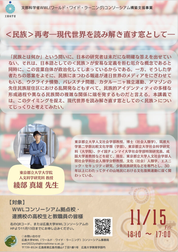 「民族とは何か」という問いに、日本の研究者は未だにな明確な答えを出せていない。それは、日本語としての<民族>が安易な定義を拒む厄介な概念であると同時に、この言葉自体が政治化してしまっているからである。一方、そうした学者たちの思案をよそに、民族にまつわる報道が連日世界のメディアをにぎわせてもいる。ウクライナ情勢、パレスチナ問題、カタルーニャ独立運動、アマゾンの先住民族居住区における乱開発などもすべて、民族的アイデンティティの多様な形成過程や異なる民族間の複雑な関係に端を発するものだと言える。本講義では、このタイミングを捉え、現代世界を読み解き直す窓としての<民族>についてじっくりと考えてみたい。