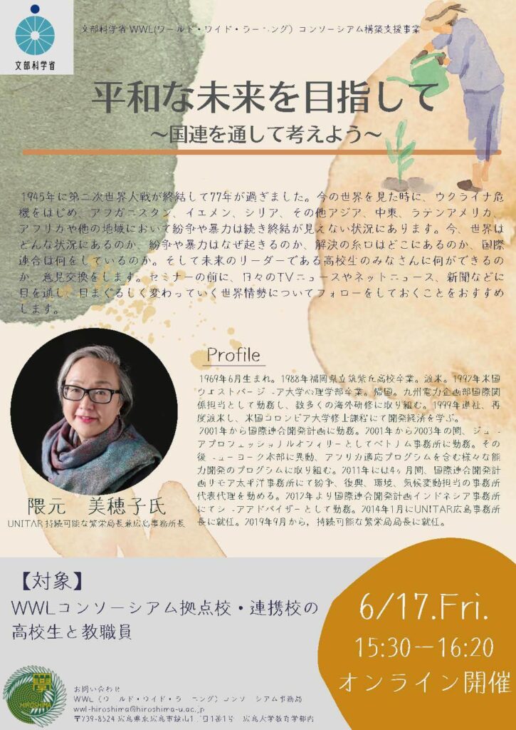 1945年に第二次世界大戦が終結して77年が過ぎました。今の世界を見た時に、ウクライナ危機をはじめ、アフガニスタン、イエメン、シリア、その他アジア、中東、ラテンアメリカ、アフリカや他の地域において紛争や暴力は続き終結が見えない状況にあります。今、世界はどんな状況にあるのか、紛争や暴力はなぜ起きるのか、解決の糸口はどこにあるのか、国際連合は何をしているのか。そして未来のリーダーである高校生のみなさんに何ができるのか、意見交換をします。セミナーの前に、日々のTVニュースやネットニュース、新聞などに目を通し、目まぐるしく変わっていく世界情勢についてフォローをしておくことをおすすめします。