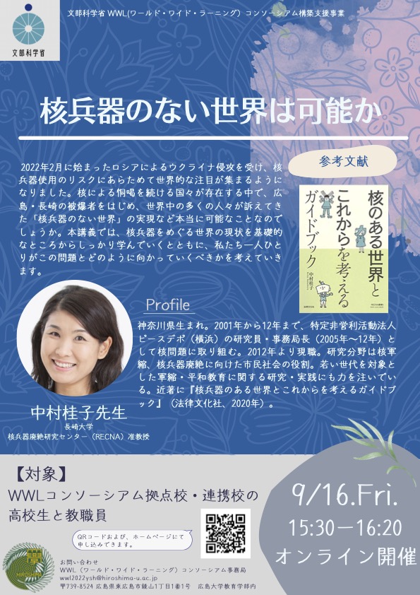 2022年2月に始まったロシアによるウクライナ侵攻を受け、核兵器使用のリスクにあらためて世界的な注目が集まるようになりました。核による恫喝を続ける国々が存在する中で、広 島・⻑崎の被爆者をはじめ、世界中の多くの人々が訴えてきた「核兵器のない世界」の実現など本当に可能なことなので しょうか。本講義では、核兵器をめぐる世界の現状を基礎的 なところからしっかり学んでいくとともに、私たち一人ひとりがこの問題とどのように向かっていくべきかを考えていき ます。