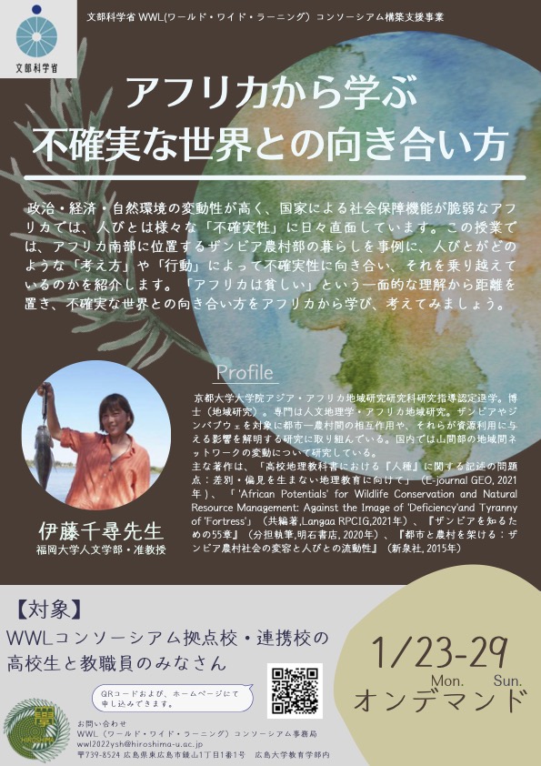 政治・経済・自然環境の変動性が高く、国家による社会保障機能が脆弱なアフリカでは、人びとは様々な「不確実性」に日々直面しています。この授業では、アフリカ南部に位置するザンビア農村部の暮らしを事例に、人びとがどのような「考え方」や「行動」によって不確実性に向き合い、それを乗り越えているのかを紹介します。「アフリカは貧しい」という一面的な理解から距離を置き、不確実な世界との向き合い方をアフリカから学び、考えてみましょう。