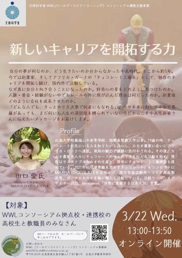 自分の夢が何なのか、どう生きたいのか分からなかった中高時代。そこから約5年。今では起業家、そしてアフリカ・ガーナの「チョコレート工場⻑」として、独自のキャリアを開拓し続け、国内外で活動している。 なぜ真に自分と向き合うことになったのか。好奇心の芽をどのように見つけたのか。 人脈・資金・経験がない中でもレールの外に飛び込んだ理由は何だったのか。起業後どのように会社を成⻑させたのか。 「どんな人でも、きっとやり方次第で何者にもなれる」。今や未来に対して不安や葛藤があっても、まだ何にも人生の選択肢を縛られていない今だからこそ中高生の皆さんに伝えたいメッセージをお届けします。